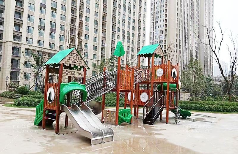 荣盛华府选用的是乐鱼游乐自主设计的具有攀爬网、U型爬网、不锈钢滑梯、网桥、滑桶为一体的综合性游乐设备。