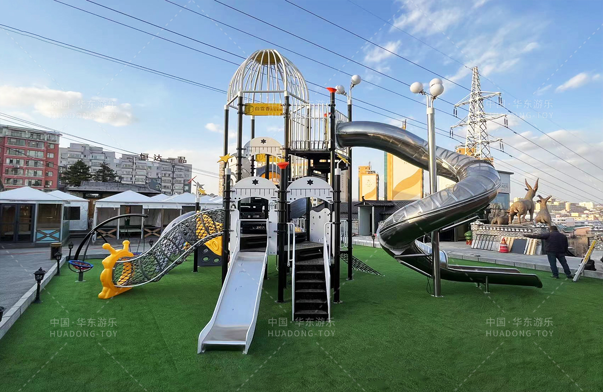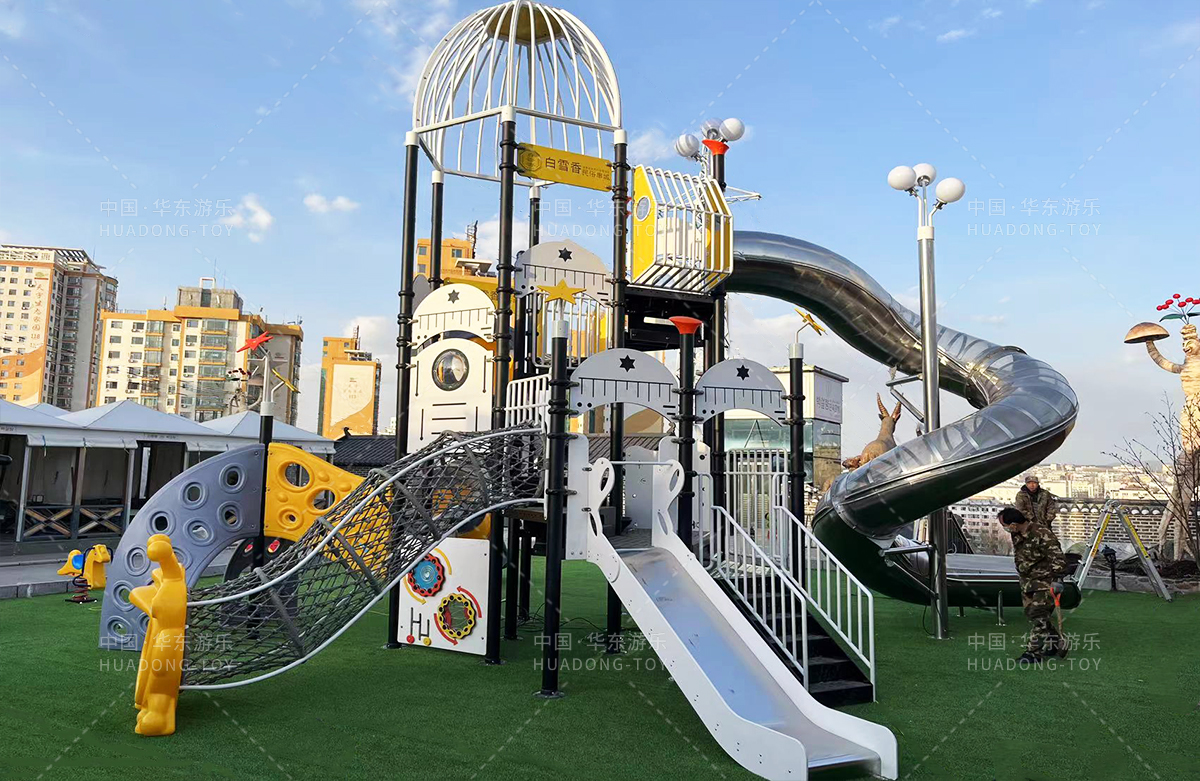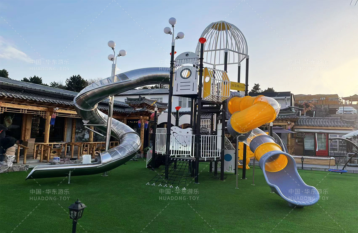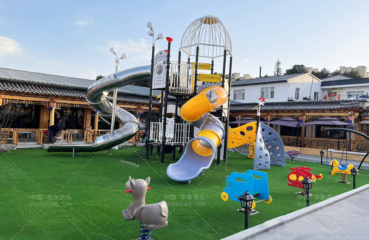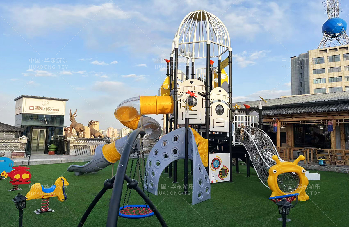 吉林省白雪香民俗烧烤城是一个专业的休闲夜宵烧烤城,此次选用的是乐鱼游乐自主研发和设计的 PE板系列滑梯,卡通的造型,齐全的功能深受小朋友们的喜爱,同时还设置了小朋友喜欢的儿童摇摇乐、组合秋千、 旋转碗等游乐设备。