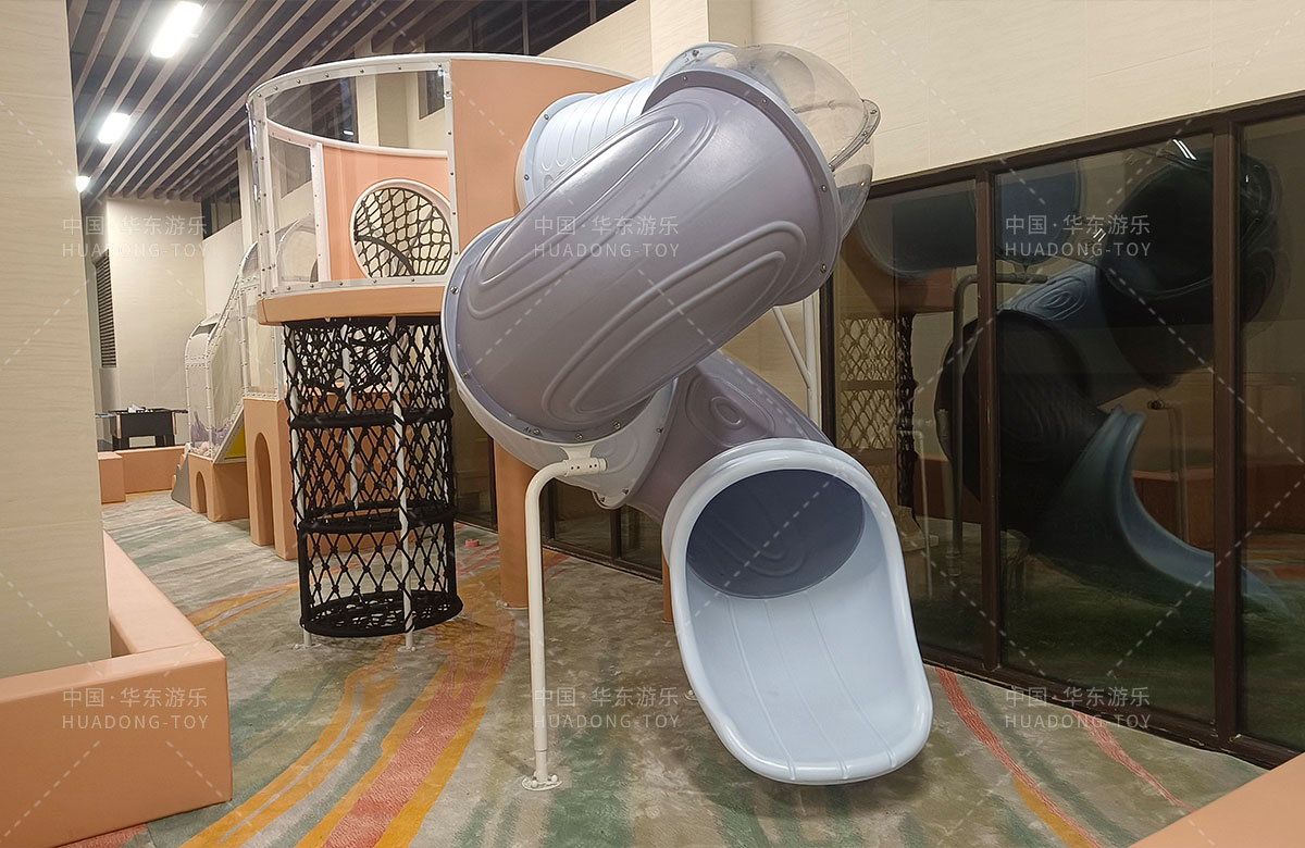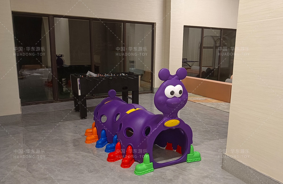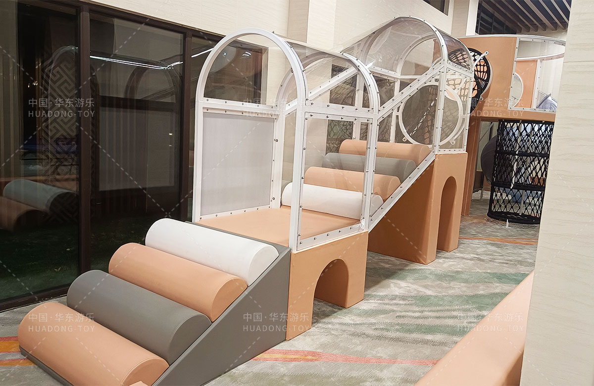 该项目选用的是乐鱼游乐生产的室内淘气堡系列产品,整套设备集合了攀爬网、钻洞、攀爬梯、旋转滑筒等功能,除此之外还设置了小朋友们喜欢的毛毛虫钻洞,儿童台球、乒乓球、桌面足球等设备,让整个售楼处变得更加的充满生机与活力。