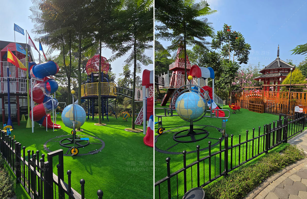 该项目选用的是乐鱼游乐自主研发和设计的跨国系列组合滑梯,该滑梯具备了攀爬网、钻洞、滑梯等功能,同时为了让整个游乐场变得更加具有生机与活力,整个项目还设置了小朋友喜欢的儿童摇摇乐、儿童跷跷板、以及地球旋转自行车等游乐设备,为当地的人群体提供了一个休闲娱乐的场所。