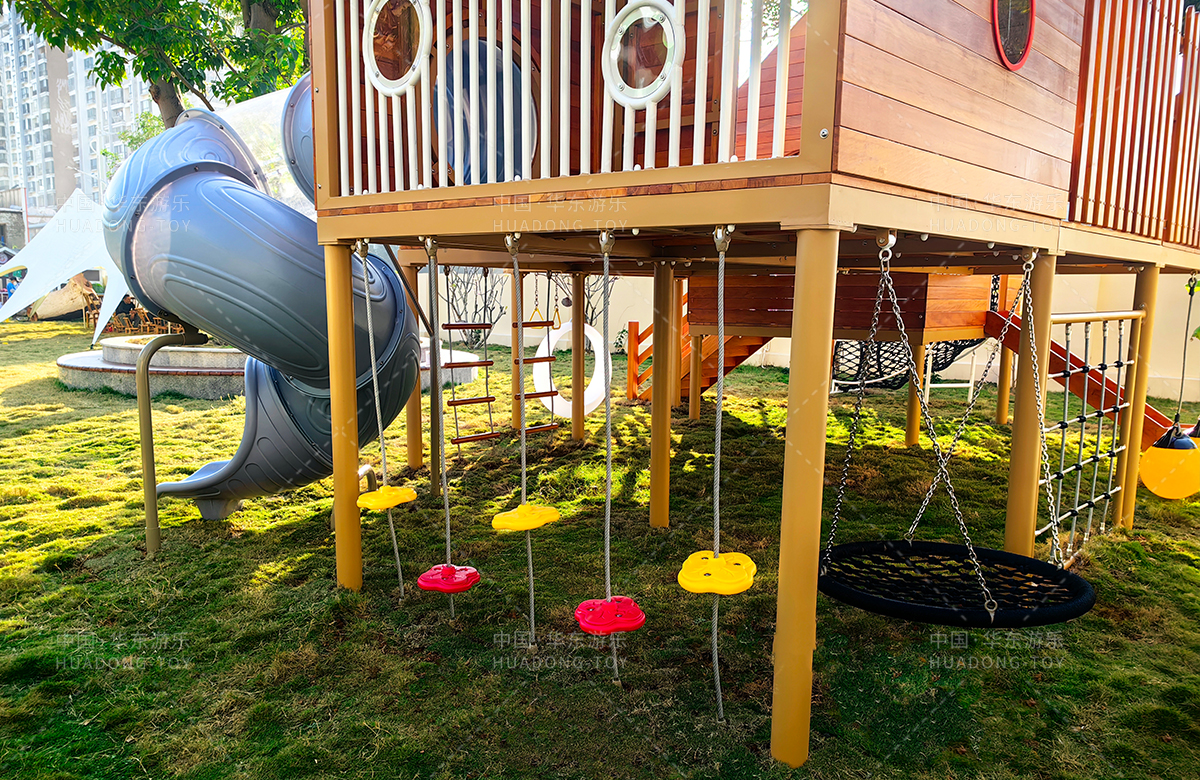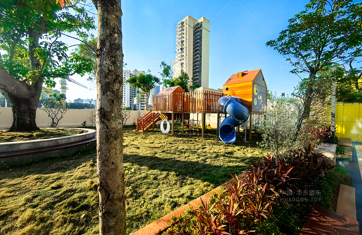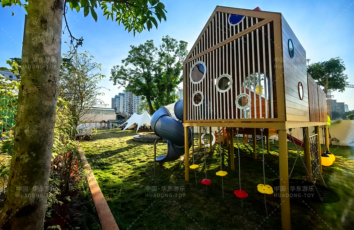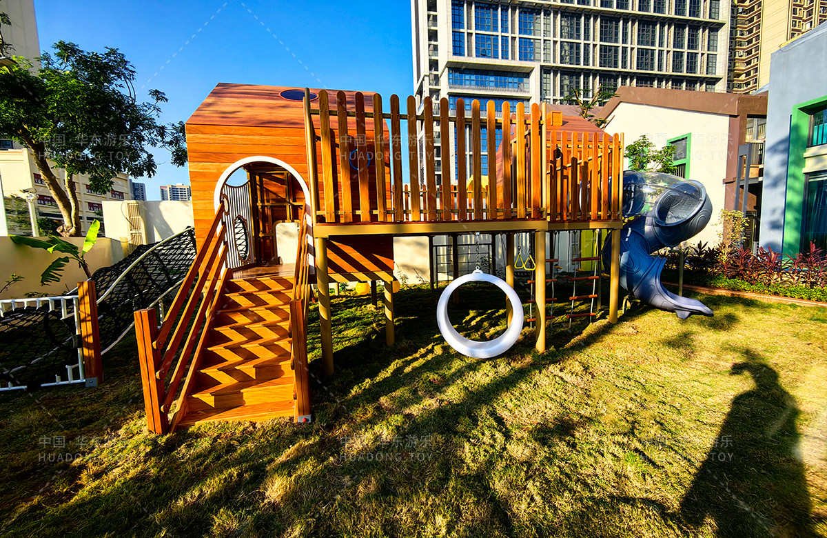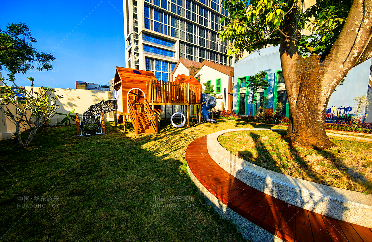 海南省农垦总局机关幼儿园选用的是乐鱼游乐自主研发和设计的木质系列非标定制的游乐设备,该游乐设备具备了攀爬网、攀爬梯、月亮秋千、旋转滑梯、儿童秋千、平衡绳等功能为一体,该游乐设备的设置不仅仅为孩子们的玩耍提供看保障,更是为老师的教学提供了帮助。